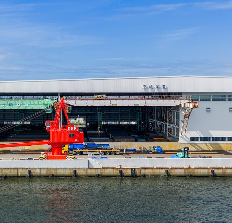 本社第二工場は、船が着ける倉庫と製缶設備を併設し、最新レーザー技術で多様な加工に応える中嶋グループの基幹工場です。