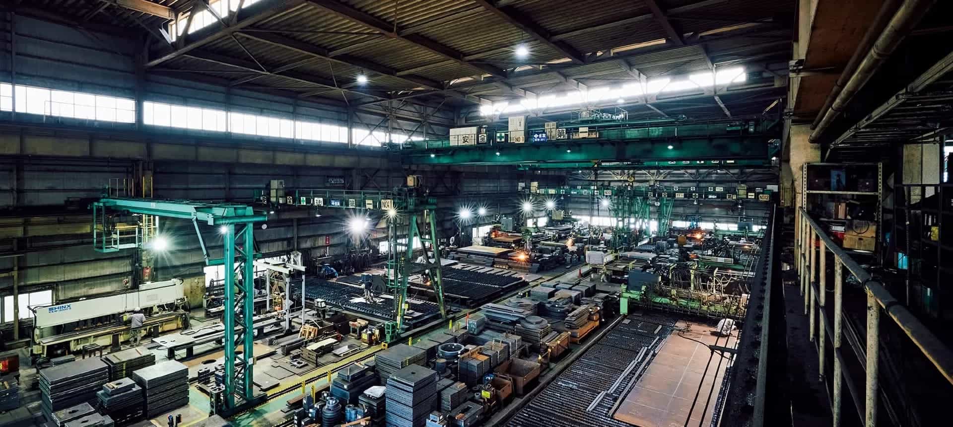 工場内は、ジャストインタイムで鋼材を加工、そして、出荷するべく機能的なレイアウト、圧倒的なパワーを発揮するクレーンを備えております。