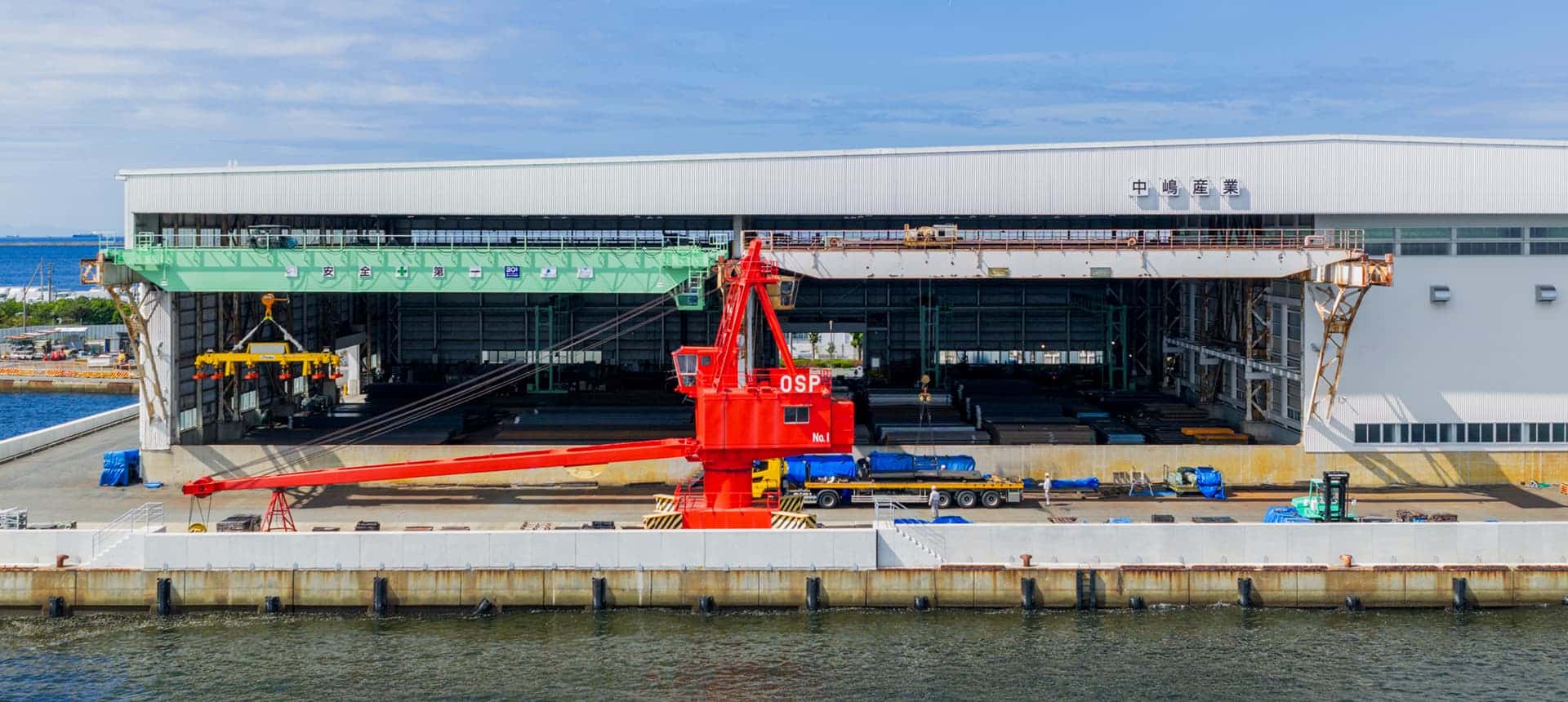本社第二工場は、船が着ける倉庫と製缶設備を併設し、最新レーザー技術で多様な加工に応える中嶋グループの基幹工場です。